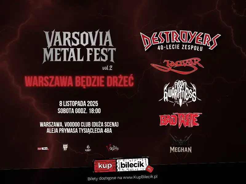 Destroyers - obchodzący swoje 40-lecie, wciąż nie zwalnia i udowadnia, że klasyka nigdy nie traci mocy. Jaguar i Bad Taste - filary polskiego heavy metalu, które od lat trzymają scenę w ryzach. Aeon of Awareness i Meghan - nowe fale emocji i świeżej energii, które idealnie dopełnią ten line-up. To nie będzie zwykły koncert - to święto metalu, które zapisze się w historii warszawskiej sceny. Jeden klub. Jeden wieczór. Jedna szansa, żeby być częścią tego ognia.