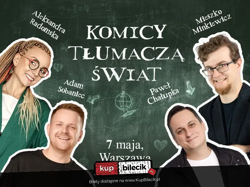 Komicy Tłumaczą Świat to nowy format komediowy na żywo, w którym improwizacja i absurd spotykają się z nieprzewidywalnością zamiast klasycznego stand-upu. Na scenie wystąpią Aleksandra Radomska, Paweł Chałupka, Mieszko Minkiewicz oraz Adam Sobaniec. Czwórka komików zmierzy się z najbardziej absurdalnymi pytaniami, od teorii spiskowych, przez niewyjaśnione zjawiska, aż po internetowe dziwactwa. Odpowiedzi będą wątpliwej jakości, ale poziom śmiechu zdecydowanie ponad normę. Na żywo wszystko może się wydarzyć - i zwykle dzieje się coś, czego nikt nie planował. To nie jest klasyczny stand-up, tylko zbiorowa próba ogarnięcia rzeczywistości przez ludzi, którzy sami mają z tym problem. Kup bilet i zobacz, jak Komicy Tłumaczą Świat.