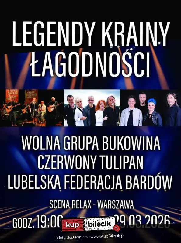 Zapraszamy Państwa serdecznie na jedyny taki koncert w Polsce. Po raz pierwszy w historii na scenie pojawią się trzy największe legendy nurtu Krainy Łagodności : Wolna Grupa Bukowina, Czerwony Tulipan, Lubelska Federacja Bardów. Bez wątpienia są to artyści ponadczasowi. Na ich wspaniałej muzyce wychowało się wiele pokoleń. Co sprawia, że koncerty tych grup zawierają pierwiastek magii i swoistego mistycyzmu? To poezja ubrana w piękne nuty prostych, odwiecznych prawd, to grono przyjaciół połączonych pasją wspólnego przeżywania muzyki, to radość ze wspólnego przebywania, to wiara w drugiego człowieka. Taka właśnie jest Kraina Łagodności.