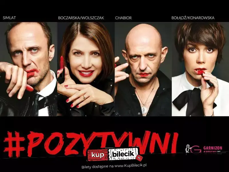 "Pozytywni" to szalona opowieść o tolerancji, akceptacji i poszukiwaniu szczęścia w gwiazdorskiej obsadzie. Na tragikomiczną sesję terapeutyczną zapraszają : Grażyna Wolszczak / Magdalena Boczarska, Olga Bołądź / Hanna Konarowska, Janusz Chabior, Łukasz Simlat oraz reżyser: Krzysztof Czeczot i autor sztuki Cezary Harasimowicz. "Pozytywni" to kultowy już i uwielbiany przez widzów spektakl, który od września wejdzie do stałego repertuaru nowo powstałego warszawskiego teatru Garnizon Sztuki. Producentem spektaklu jest Fundacja Garnizon Sztuki. Będzie śmiesznie, będzie wzruszająco... Rzecz rozgrywa się w gabinecie terapeutycznym. Ewa jest wybitną psychoterapeutką. Piękna, bogata, ciesząca się uznaniem, ma szczęśliwą rodzinę, udane życie i wydaje się, że wszystko jest piękne i idealne. Poznajemy jej pacjentów: Michała - geja, rolnika spod Mławy; Annę - arystokratkę, która odkrywa swoje -bynajmniej niearystokratyczne! - korzenie oraz Jana, męża i ojca dwójki dzieci, który od dawna czuje się kobietą. Jaki będzie rezultat serii spotkań terapeutycznych? Niech pozostanie tajemnicą.