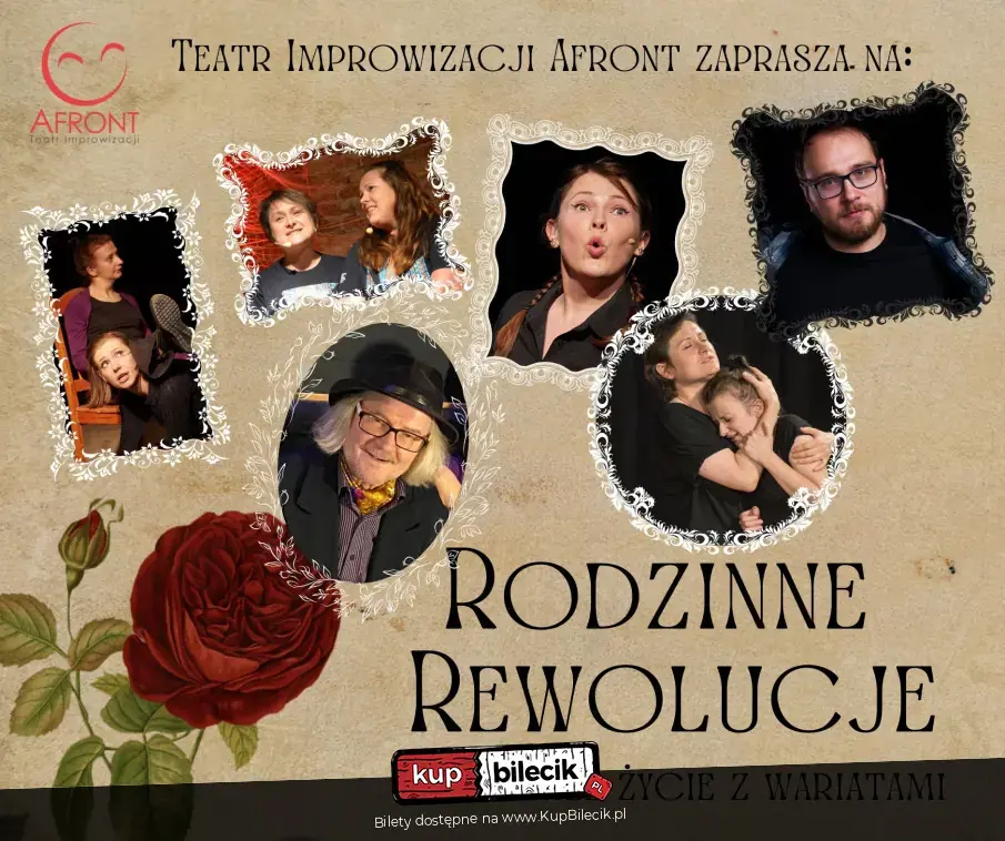 Na te i inne trudne pytania natury rodzinnej Teatr Improwizacji AFRONT zechce znaleźć odpowiedzi w swojej długiej formie pt. "RODZINNE REWOLUCJE, czyli całe życie z wariatami", sterowanej jak zwykle przez Was, o Najwspanialsza Publiczności Świata. To Wy powiecie nam, jakich członków rodziny zechcecie zobaczyć i jakiemu wyzwaniu będą musieli stawić czoła. Czy zechcecie, aby babcia - bojówkarka wraz z ciocią - hipochondryczką i wujkiem o zapędach kryminalnych musieli odebrać dziecko z przedszkola, czy też aby mama z PMS-em, szwagier - narkoleptyk, teściowa - niespełniona acz praktykująca artystka oraz dziadek - perfekcyjny słomiany wdowiec podróżowali stopem na uroczystości pogrzebowe - cokolwiek to będzie, my to wszystko pokażemy. I możemy zapewnić, że będzie się działo!