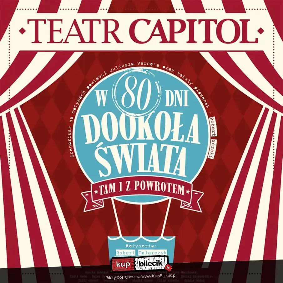 Spektakl oparty na znanej powieści Juliusza Verne'a, w adaptacji Roberta Górskiego, to dynamiczna, komediowa opowieść pełna błyskotliwych dialogów, zaskakujących zwrotów akcji i charakterystycznego humoru. Na drodze bohaterów stają barwne postaci z różnych stron świata, jednak największym zagrożeniem okazuje się zdeterminowany inspektor Fix - depczący Foggowi po piętach policjant, którego pościg w każdej chwili może doprowadzić do przegrania wielkiego zakładu. W tej walce z losem liczy się każda sekunda i... czas, który nieubłaganie ucieka. Całość przedstawienia zachwyca wyjątkową warstwą muzyczną oraz pełną energii choreografią. Istotnym wyróżnikiem spektaklu jest scenografia, wzbogacona o projekcje, animacje i efekty wizualne, która w jednej chwili przenoszą widzów z Londynu do Indii, z oceanu na amerykańskie bezdroża. Zmieniające się obrazy harmonijnie współgrają z akcją sceniczną, muzyką i ruchem, tworząc widowisko pełne teatralnej magii.